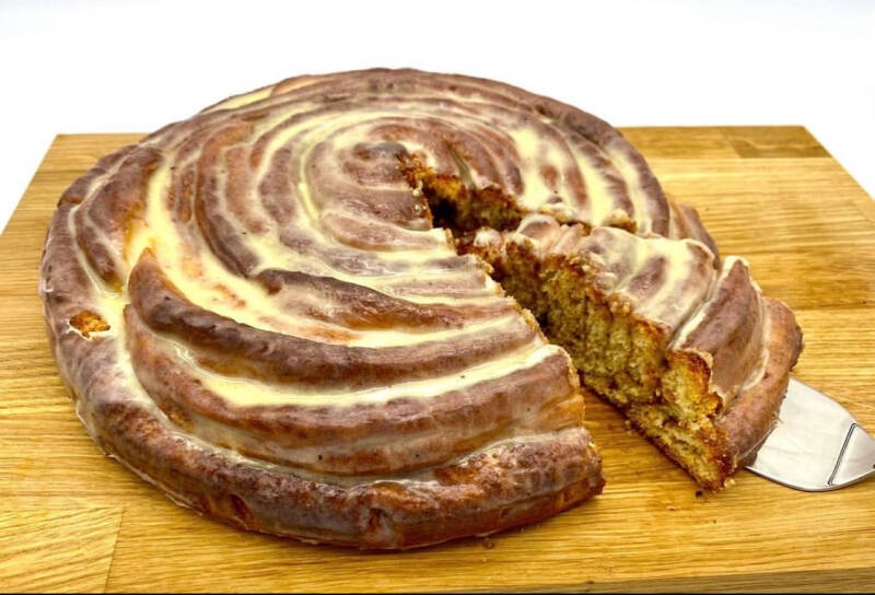 Guss über der Zimtschnecke verteilen, kurz trocknen lassen, Zimtschnecke in 8 Stücke verteilen und frisch servieren.